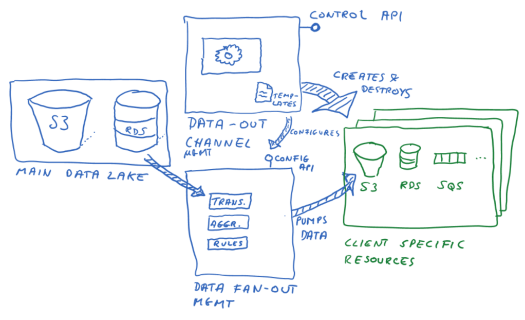- Data-Fan-Out management which needs a configuration API and inner functions that allow to bring the data from our central data lake into the desired client specific technology and format (at least including transformations, aggregations and fan out rules)