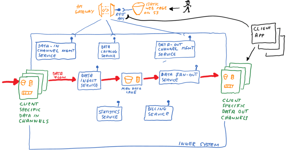 Note: In front of your API Gateway (data-out API) you can of course place a web user interface that uses the very same API if you want to enable human users to administrate their data out channels. Here you could use a static web page hosting using S3 or any other web-serving option (e.g. AWS Beanstalk). In any way you should make use of the same API from that UI, so that there is no difference in the implementation of the API business logic.